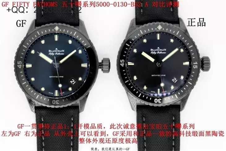 GF宝珀陶瓷新五十噚5000系列真假对比【复刻评测】提到GF工厂,相信大伙一定会对百年灵的高品质都略有所闻,超高的乱真程度和极低的返修率,得到了很多表友的信赖。最近,GF厂又跨界带来了一款全新的表款--GF厂宝珀五十噚陶瓷5000复刻版!接下来名表城复刻通过与正品对比,来为您测评下这款表!