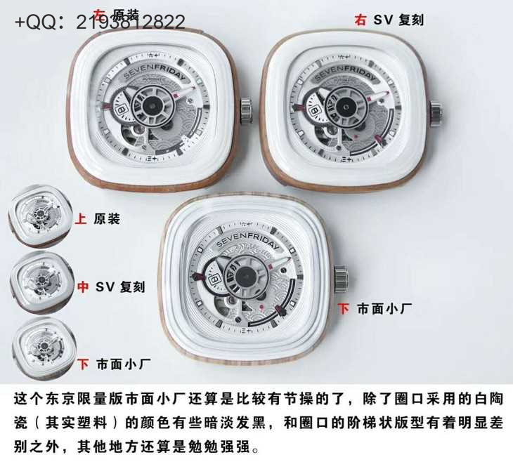 接下来给大家带来SV厂版日本樱花限量P1B/03与正品的对比 总结:SevenFriday是瑞士设计、日本机芯、中国制造,由于中国制造的关系,SV厂独家采用了部分正品的部件,打造出了最好版本。特别是是这款日本樱花限量P1B/03版SV厂在复刻时完全遵循原版材质,不仅是实木表框还是机芯等均做到了和正品一致,...