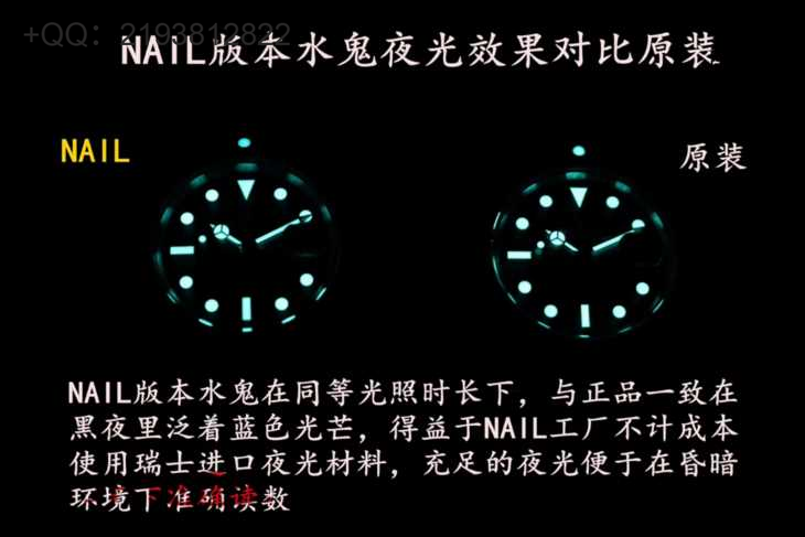 陶瓷圈:绿色陶瓷圈达到正品99% 的翠绿,黑水鬼达到100%无色差。与原版一样镀白金刻度,耐脏,不发黑,夜光珠饱满晶莹剔透。转圈:潜水转圈有吸引力,每一齿的刻度定位清晰,和原版一样有一种被拖住的感觉,转动时不会感觉生硬或跑位(这一点目前只有NAIL厂做得到),声音和原版一样清脆悦耳。材质:全表904L精钢(...