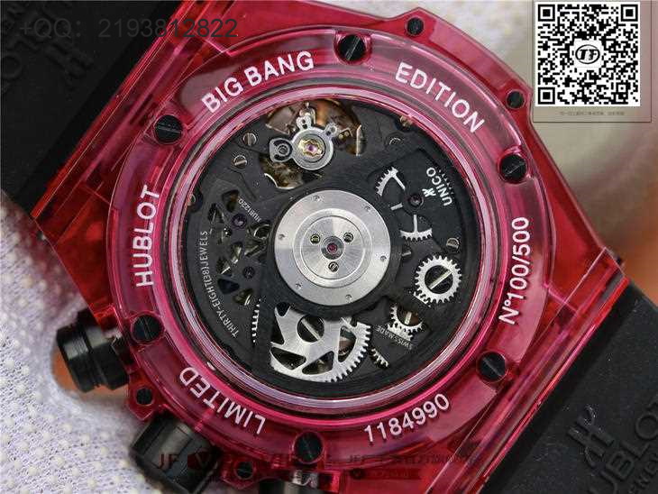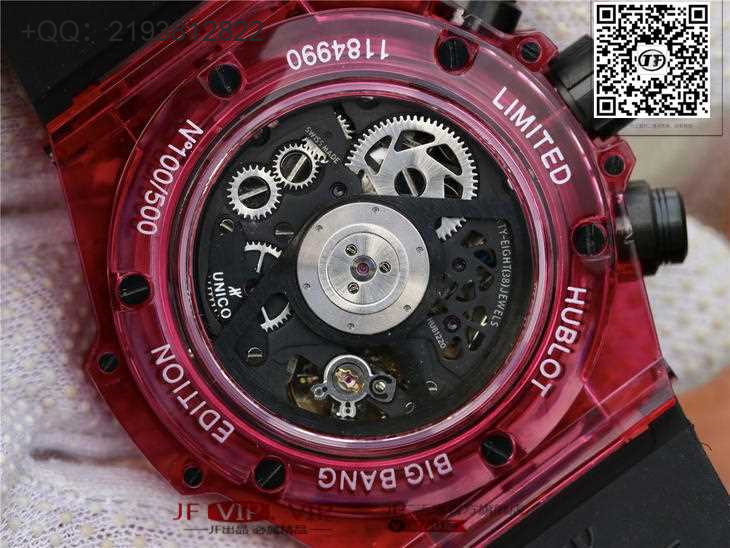 HB宇舶表年度最佳复刻作品——宇舶BIG BANG系列411.JX.4802.RT“全透腕表”【精彩细节】1.还原正品表盘后龙飞凤舞的镂空布局,2.采用与原装同样的丙烯酸有机玻璃极致克隆——完成不可能完成的任务。该材质不仅硬度高,且具有抗腐蚀,耐磨损等卓越物理特性。【机芯功能】腕表直径45mm。采用增强版7750机芯改原装HUB.1242型芯,实现所有功能吻合正装。【精益求精】HB工厂全力以赴,层层把关,在保证完美“透视感官”的同时,竭心尽力还原正品的每个细节。【赠品】附赠一副同款不同色的天然橡胶表带(可替代原装)复刻界首款“全透佳作”