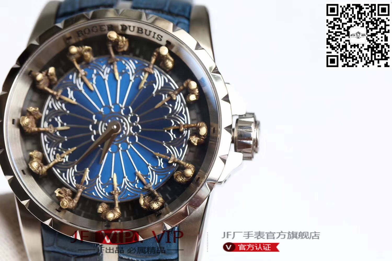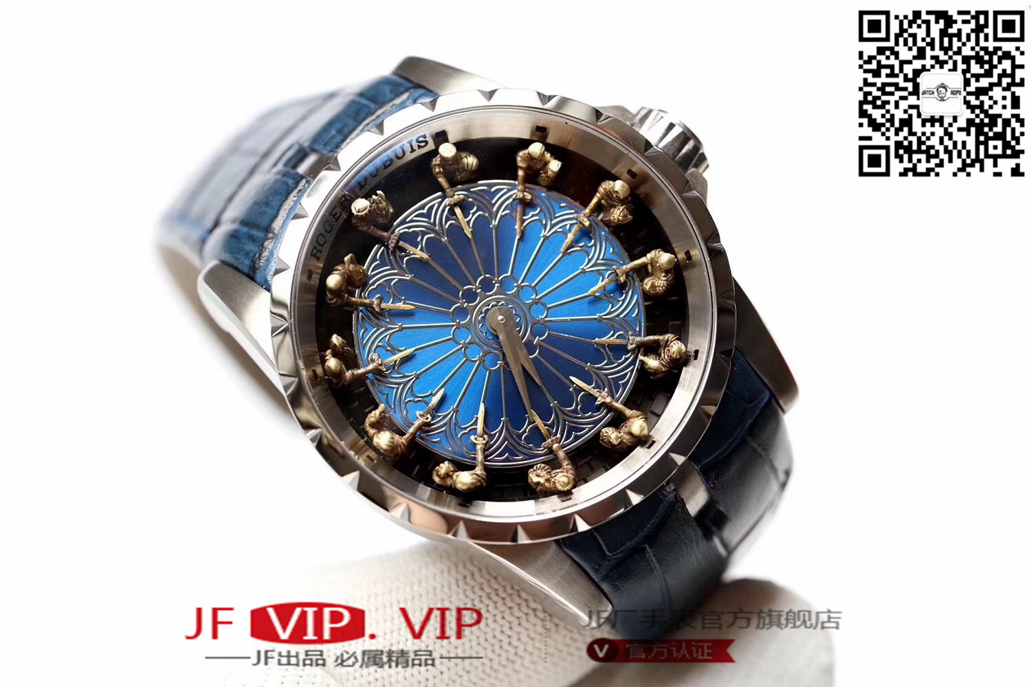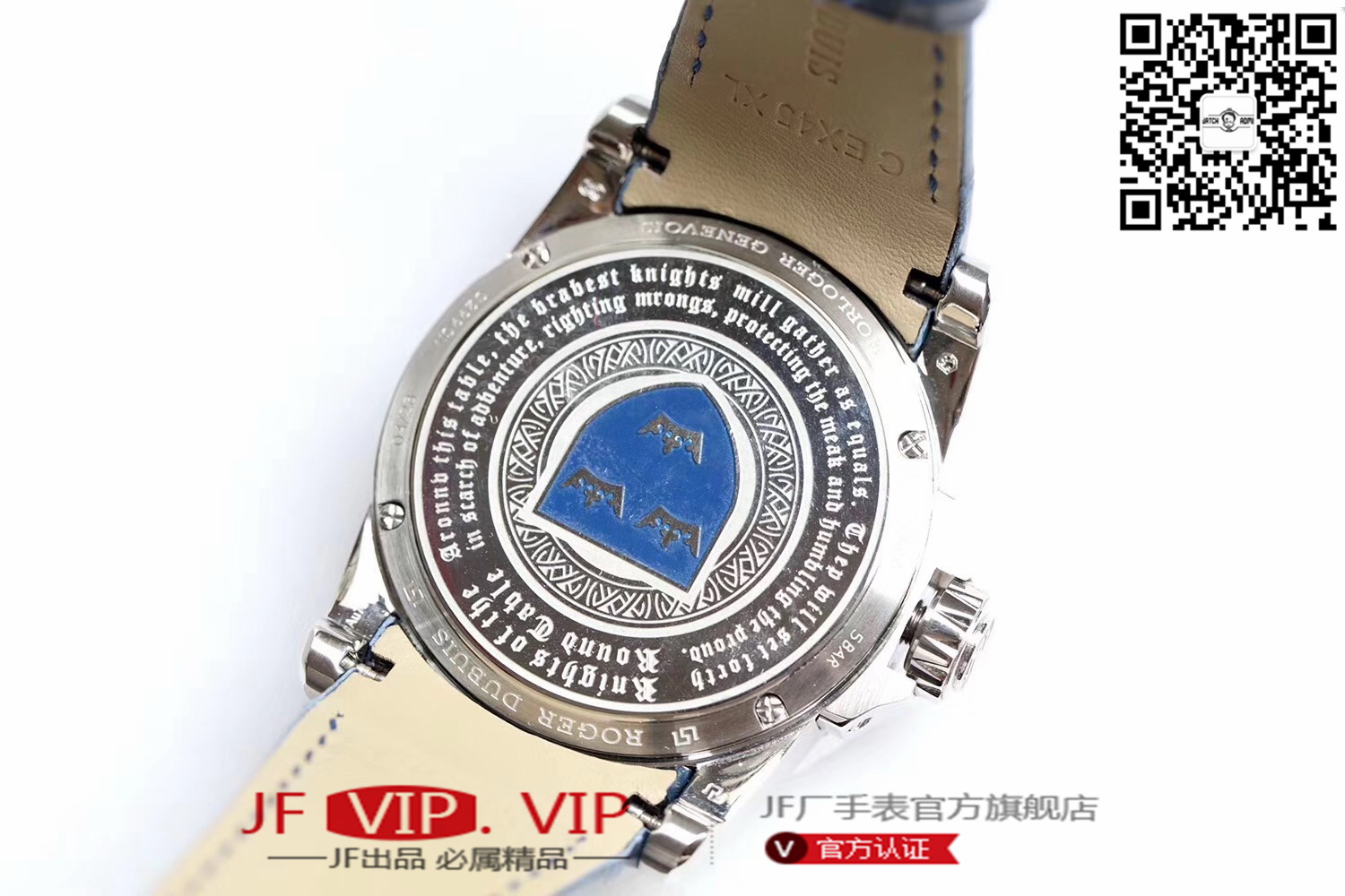 罗杰杜彼圆桌骑士型号:RDDBEX0511 表盘:彩色珐琅工艺表盘 表壳:316l精钢 电镀18k金 尺寸:45*15.7mm