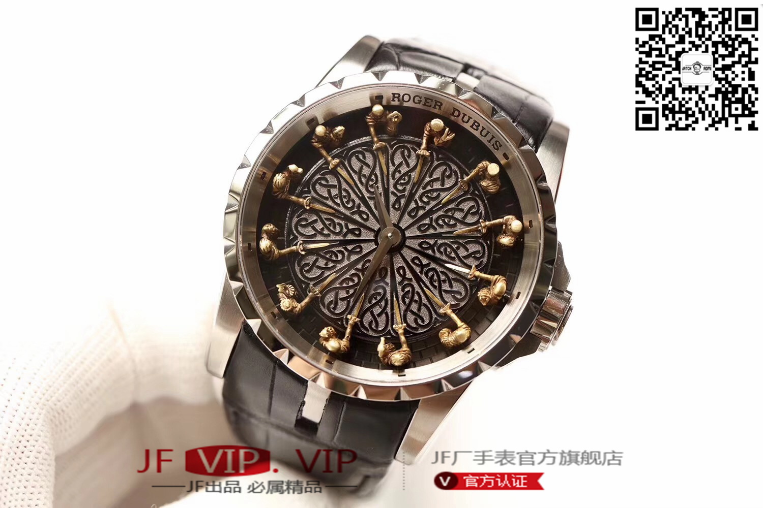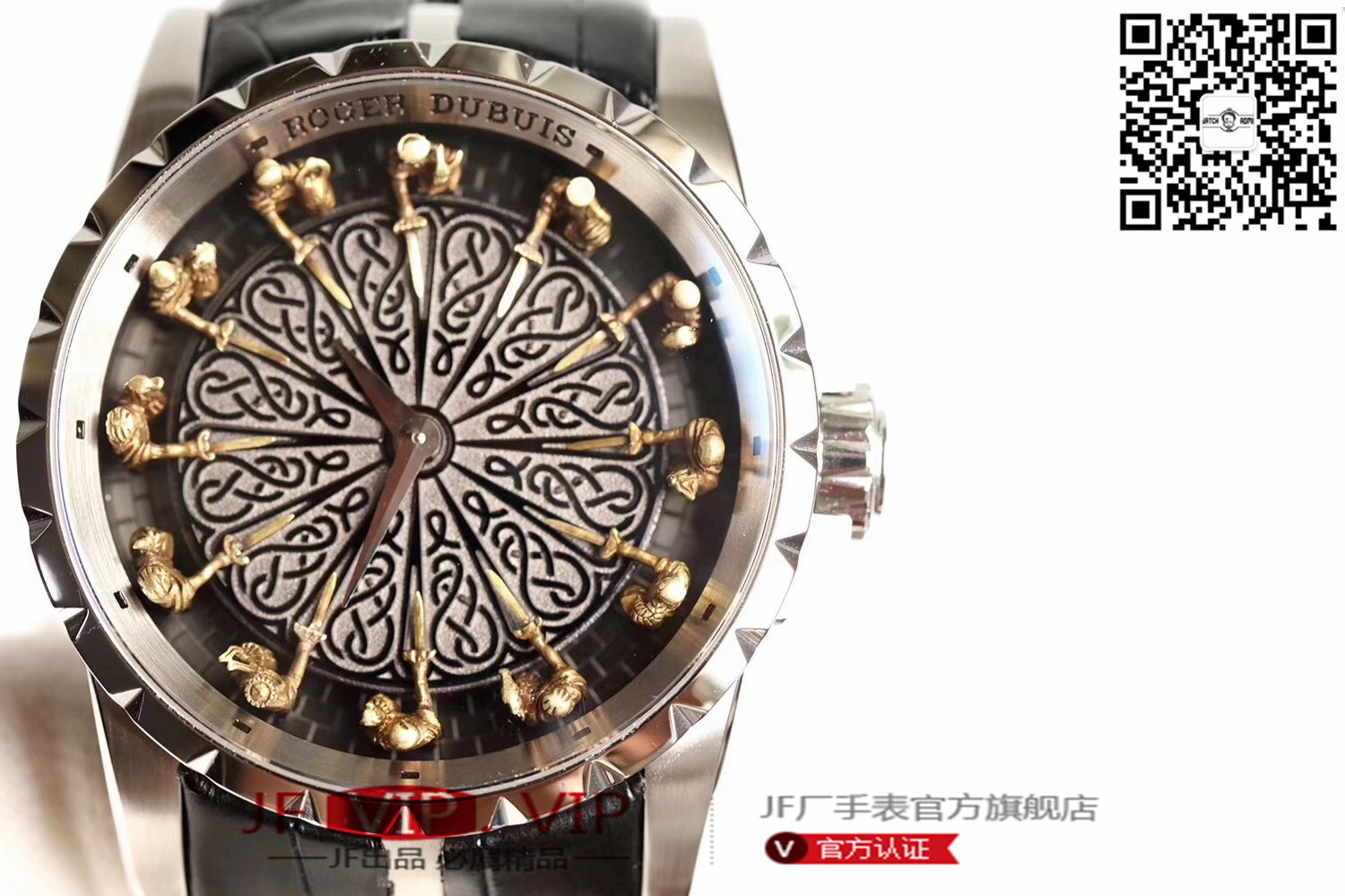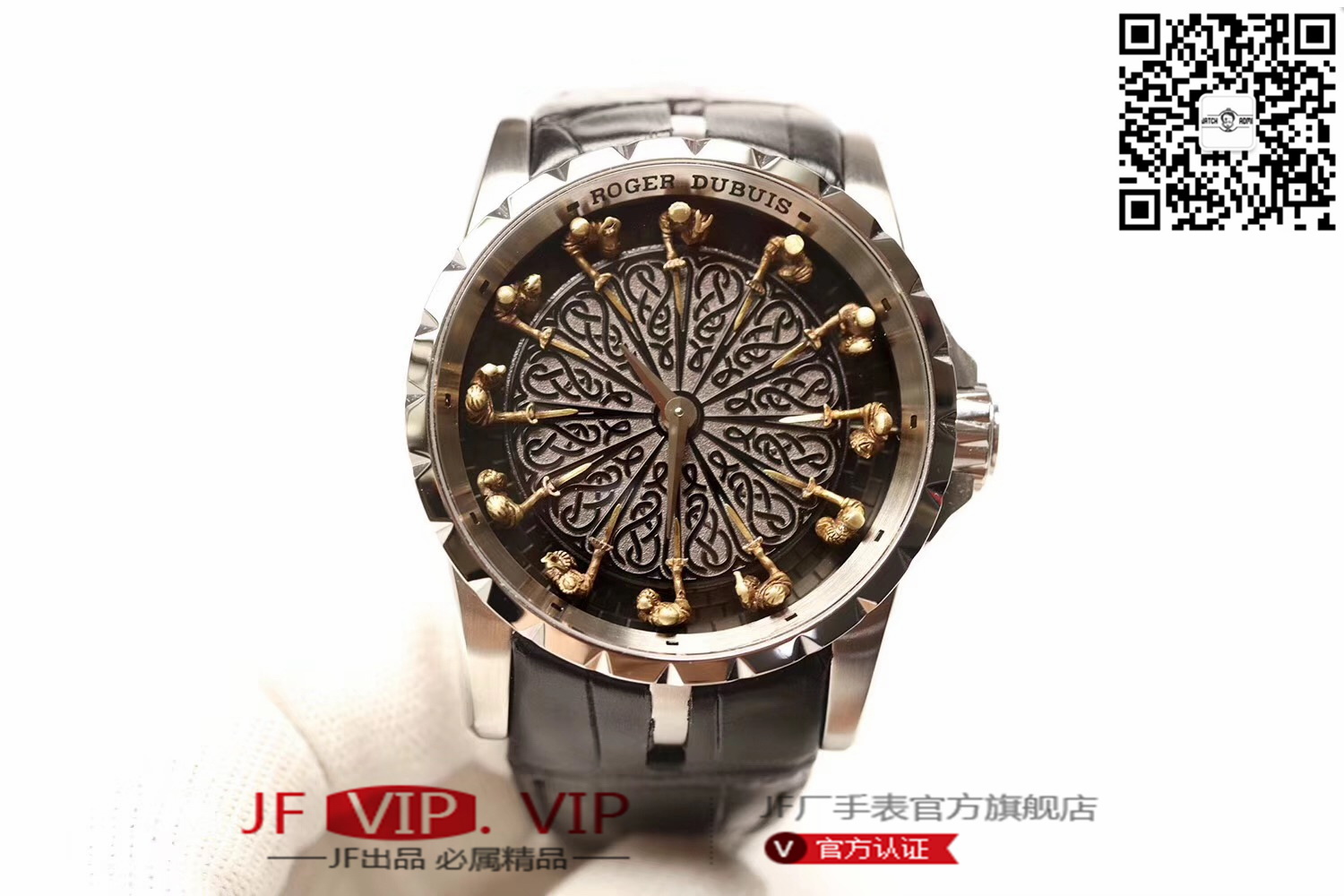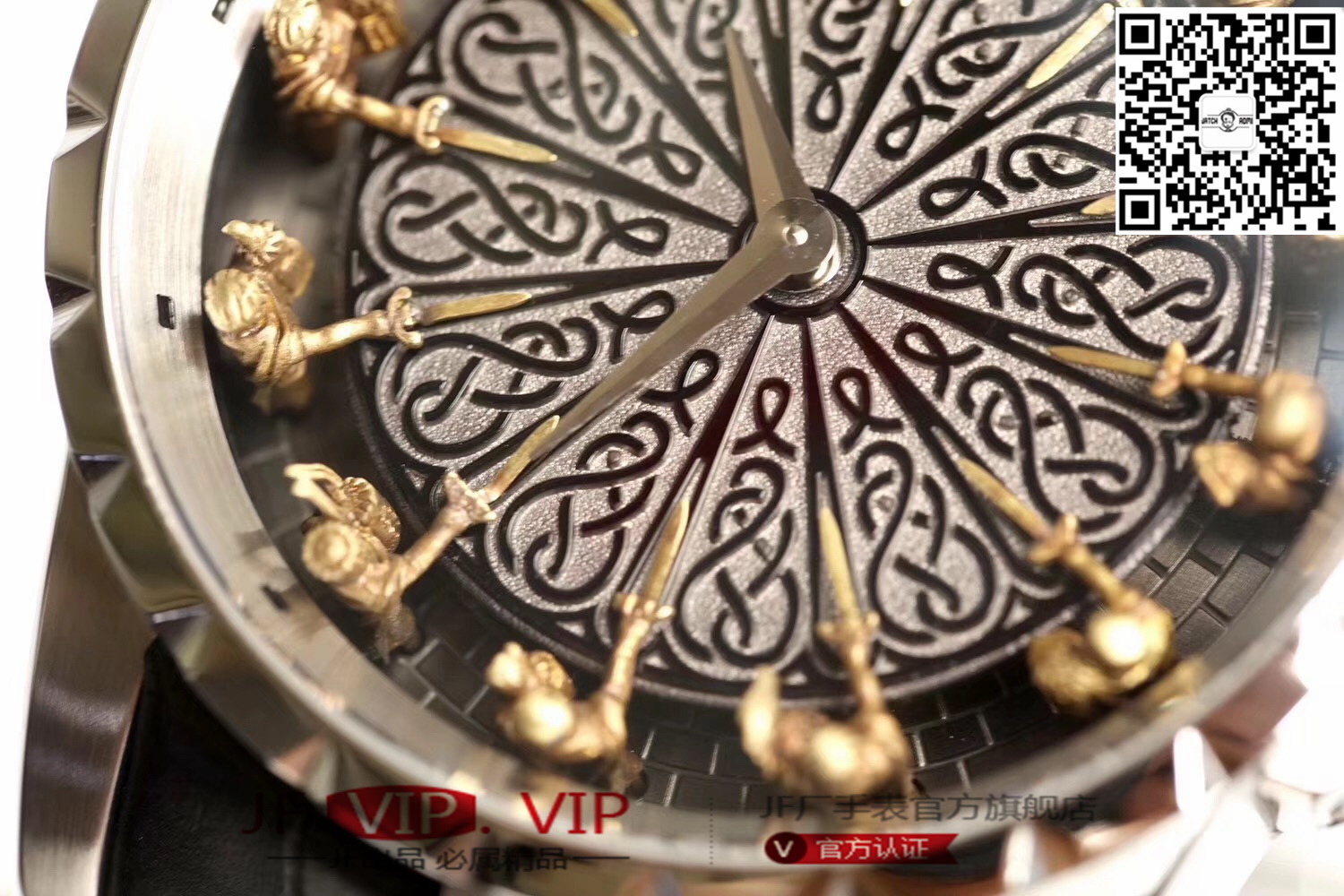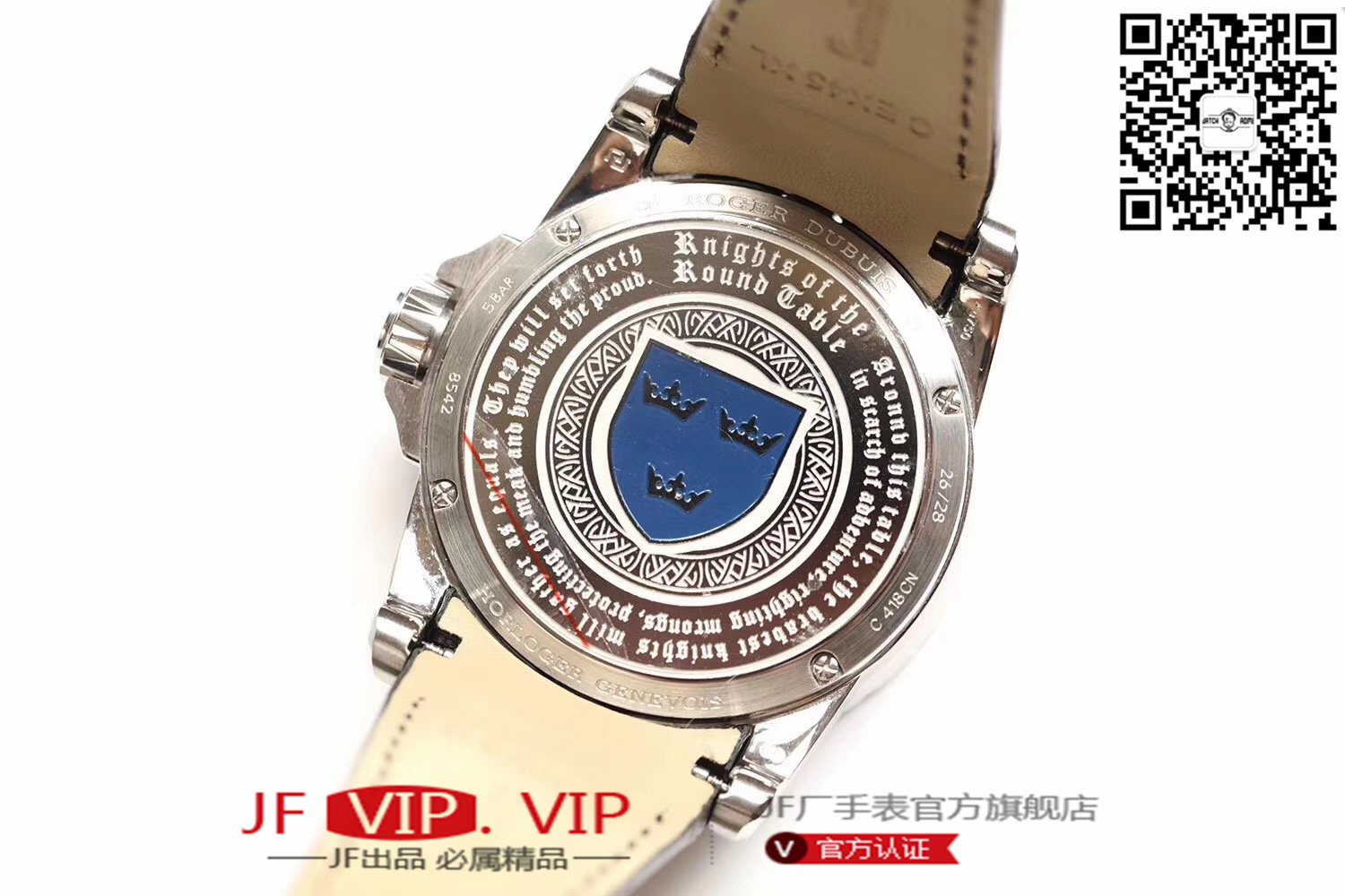 罗杰杜彼圆桌骑士型号:RDDBEX0511 表盘:彩色珐琅工艺表盘 表壳:316l精钢 电镀18k金 尺寸:45*15.7mm
