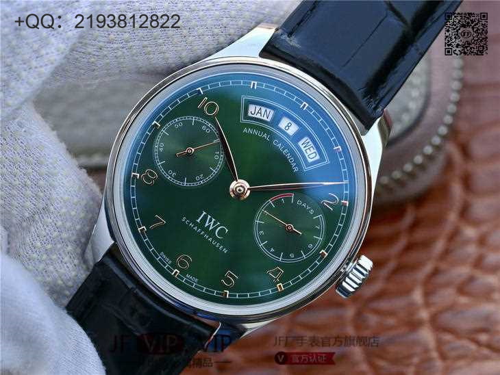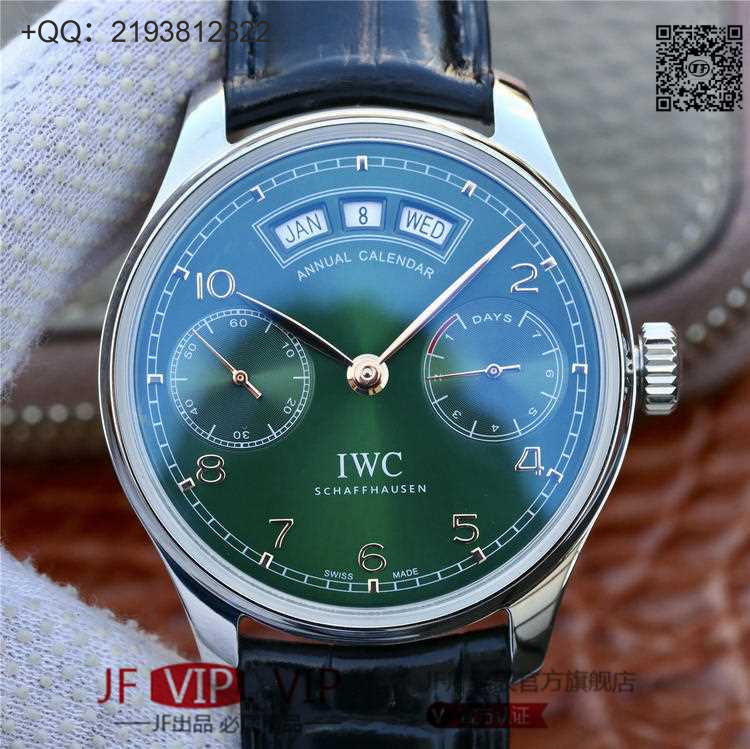 万国葡萄牙万年历腕表系列  镜面为双面防反光拱形边缘蓝宝石玻璃表镜,夜蓝色的表盘。年历的显示设计简洁利落,以三个独立的半圆形视窗分别显示月份、日期以及星期,设于11点到1点的刻度之间。小三针的设计,3点钟位动力储备槽显示,9点钟位设小秒盘。外援轨道式分钟刻度位及阿拉伯数字小时位显示。布局整洁,阅读时间日期非常方便。