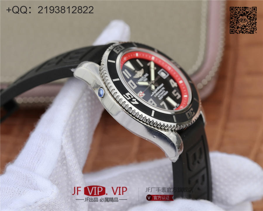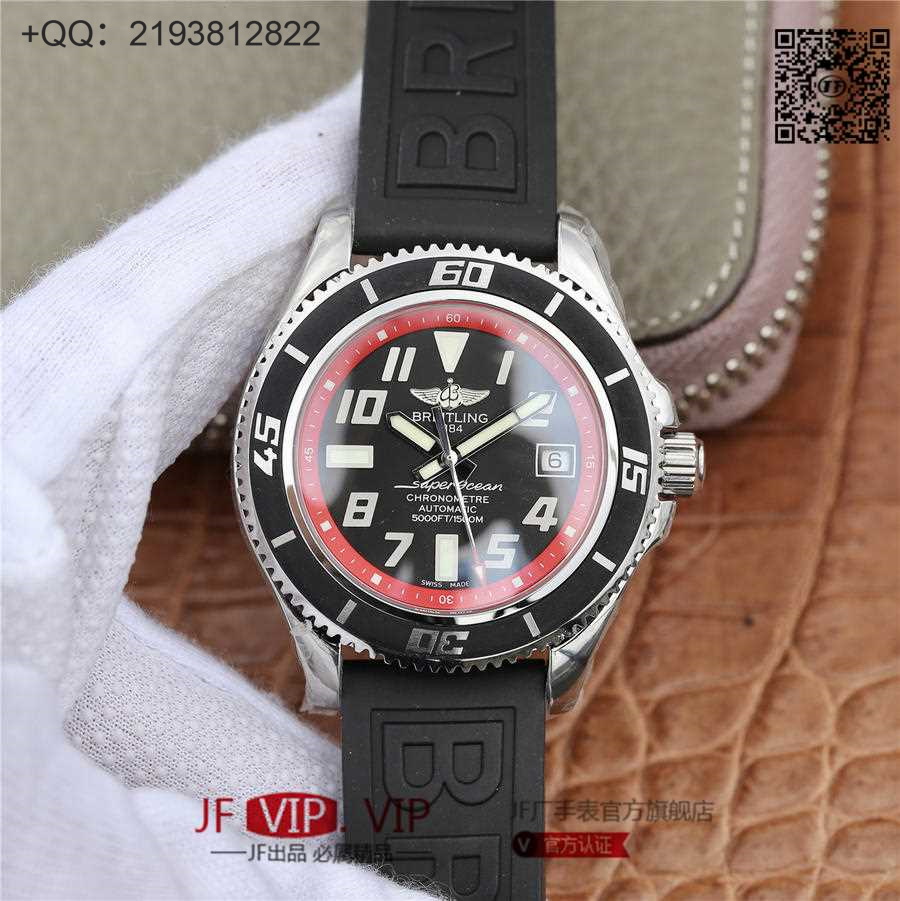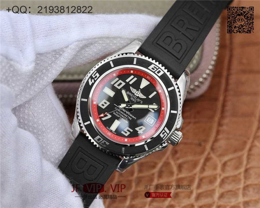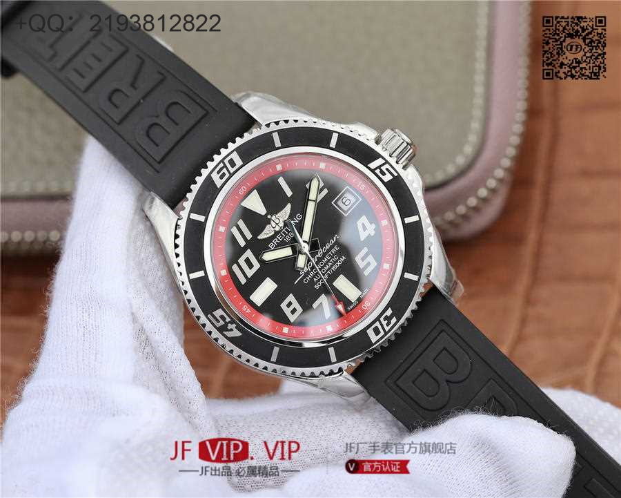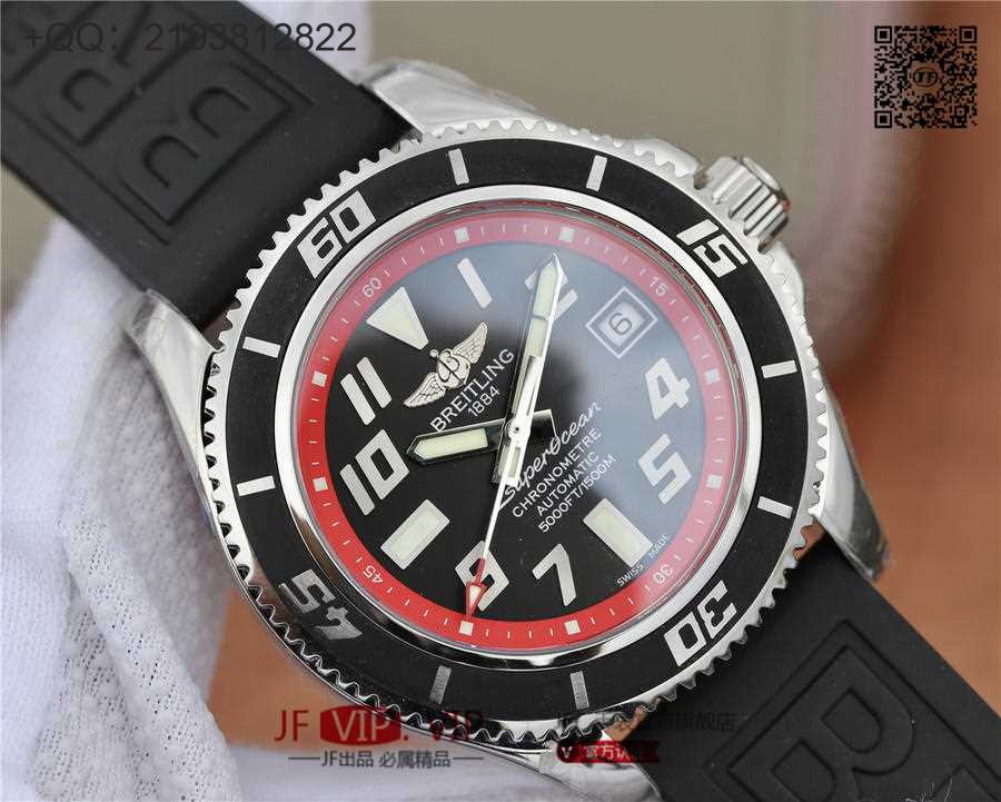 GM百年灵SUPEROCEAN42超级海洋42腕表系列超级海洋42腕表(Superocean42)将绚丽色彩大胆运用在分钟刻度斜角内圈,配有黃,紅,藍,黑和白5種顏色,酷黑的表盘上点缀着阿拉伯数字刻度,典型的大指针令读时一目了然,日历显示窗口位于三点钟位置,指针和刻度都拥有夜光涂层,令腕表在黑暗的状态下也可以轻松读时。黑色的橡胶表带具有非常好的防水性能,同时佩戴在手腕上,柔软舒适。