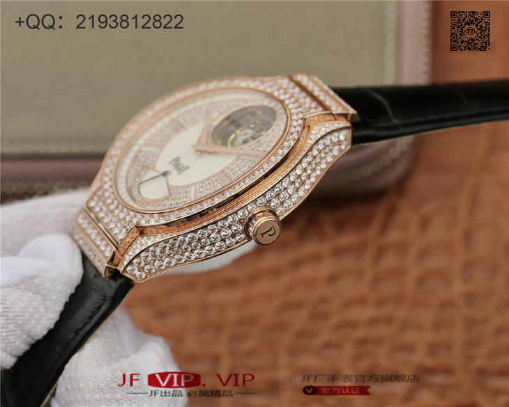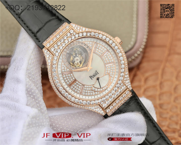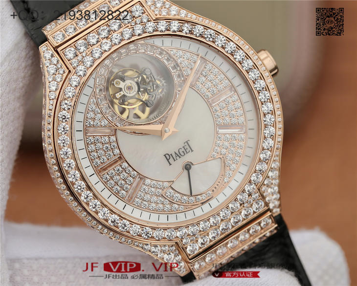 R8伯爵P0L0一G0A38148真飞轮、再一次突破伟大工艺的技术界限,首款研发伯爵摆轮及制作机蕊。 搭配海鸥订制Cal.600P陀飞轮机芯、12点位置飞轮、6点位置动力储能显示.表壳直径46mm、厚度12mm这枚腕表挑战技术极限、实现同类型腕表中独一无二精湛技术;配备白色珍珠贝壳表面,镶衬28颗方形美钻、带有伯爵“P”字标志的浮动式陀飞轮设计轻灵纤巧,在12时位置轻盈飞转。将珠宝镶嵌运用到名表上、是一场华丽神奇的邂逅。也是两种决然不同的艺术气质的融合,一面是严谨精密,一面是奢华张扬。