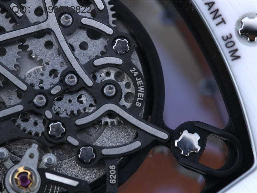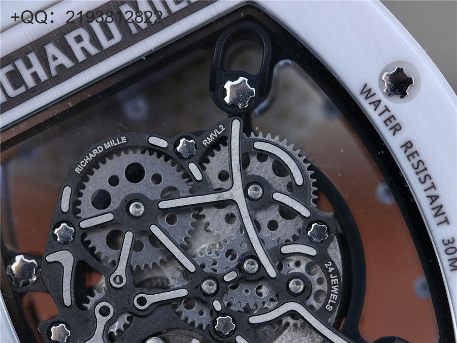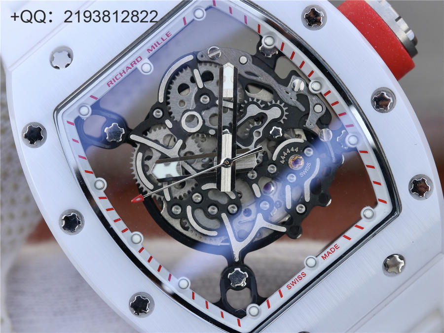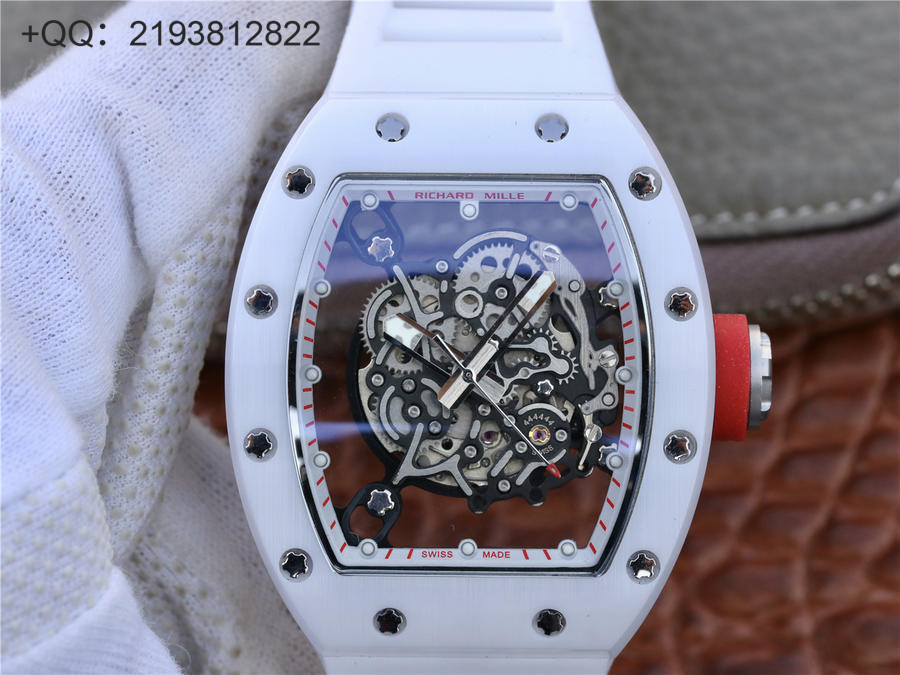 RM理查徳米勒RM055 表圈和底盖采用纳米陶瓷复合材料,具有耐划伤性和抗变色性,且陶瓷纹理清晰,外观臻于完美。无表盘设计,镂空机芯可以从正面和底面均能一览无余,让你爱不释手!卓越品质。